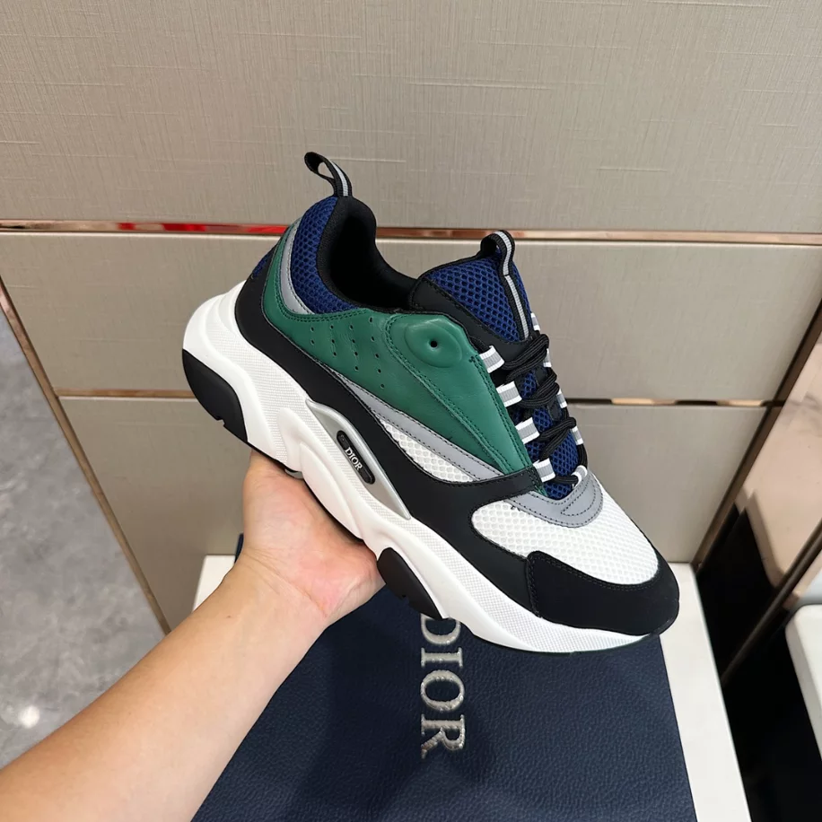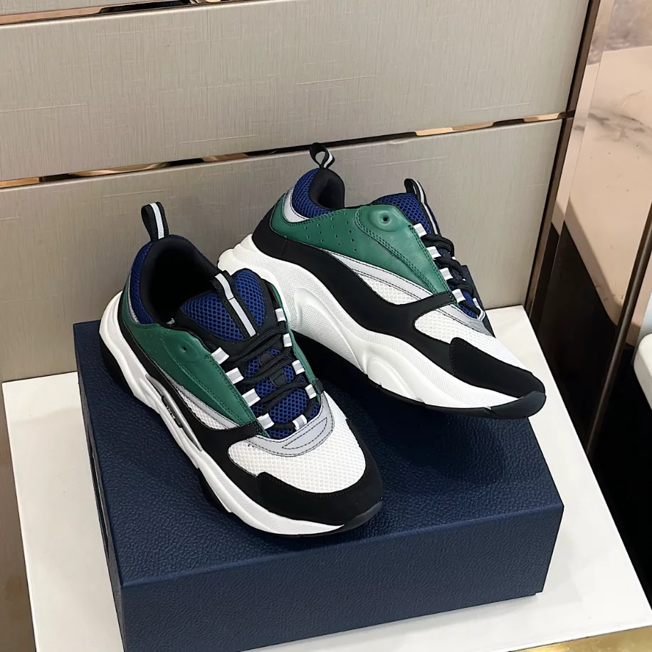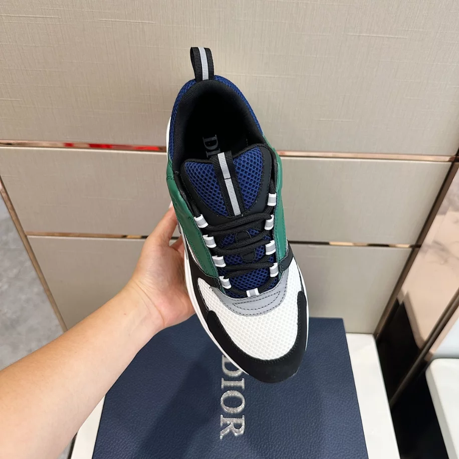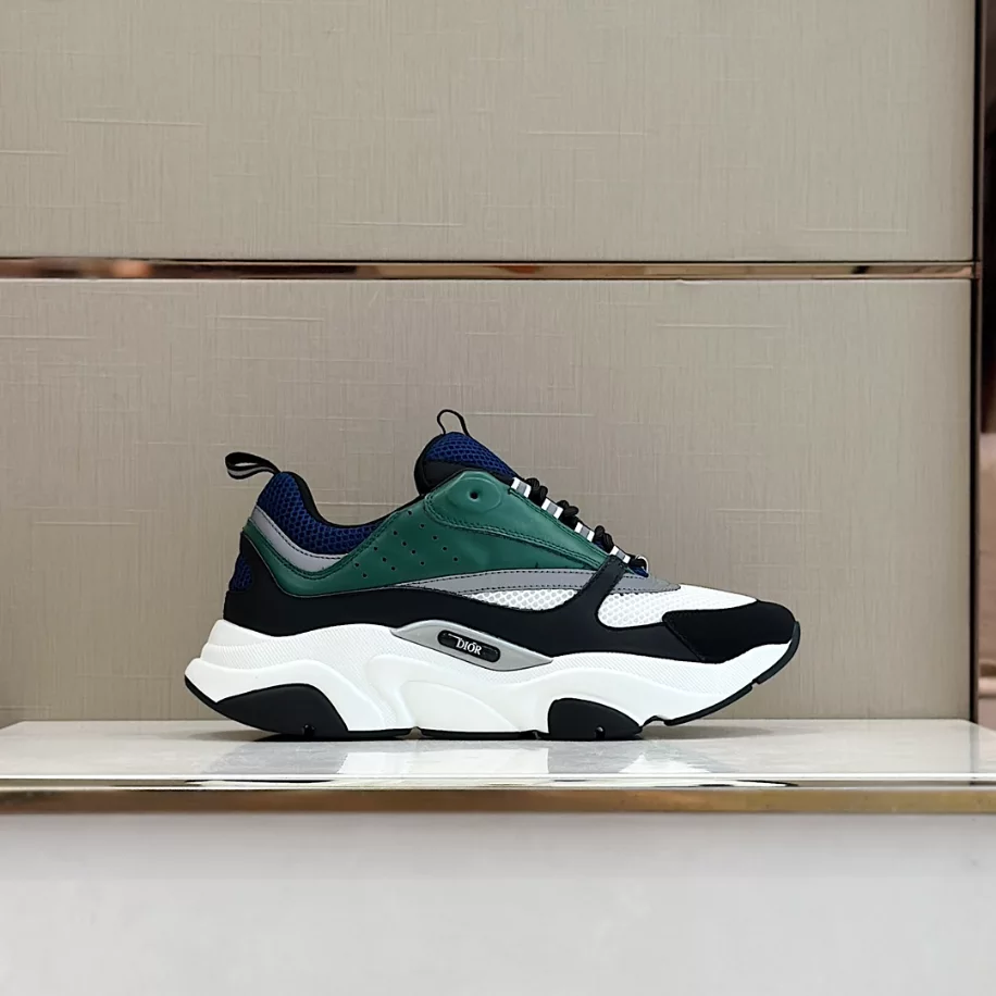 The B22 sneaker is not just a fashion item but a sophisticated blend of elegance and practicality. With a design that echoes classic running aesthetics. it features high-tech materials such as breathable mesh and soft leather crafted with meticulous welding technology. A standout feature is the boldly undulating midsole. prominently displaying the Dior Homme logo. along with refined calfskin pull tabs on the heel and tongue. ensuring both luxury and convenience for the wearer.