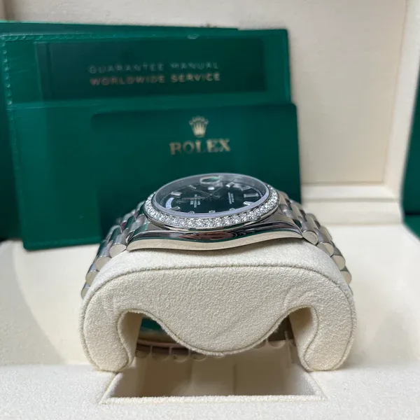 This dial features 10 baguette-cut diamonds. The sunray finish creates delicate light reflections on many dials in the Oyster Perpetual collection. It is obtained using masterful brushing techniques that create grooves running outwards from the centre of the dial. Light is diffused consistently along each engraving, creating a characteristic subtle glow that moves depending on the position of the wrist. Once the sunray finish has been completed, the dial colour is applied using Physical Vapour Deposition or electroplating. A light coat of varnish gives the dial its final look.