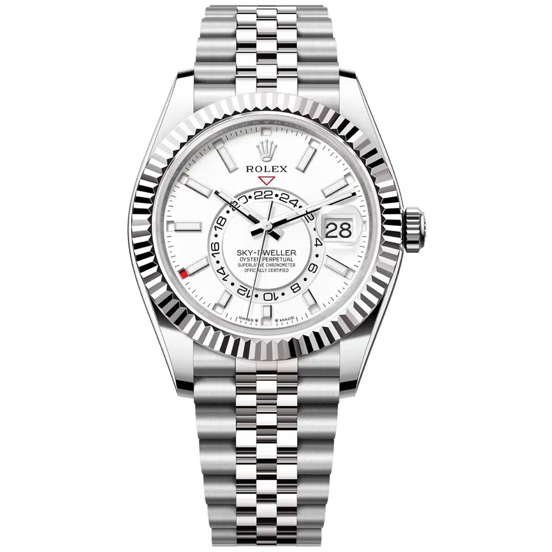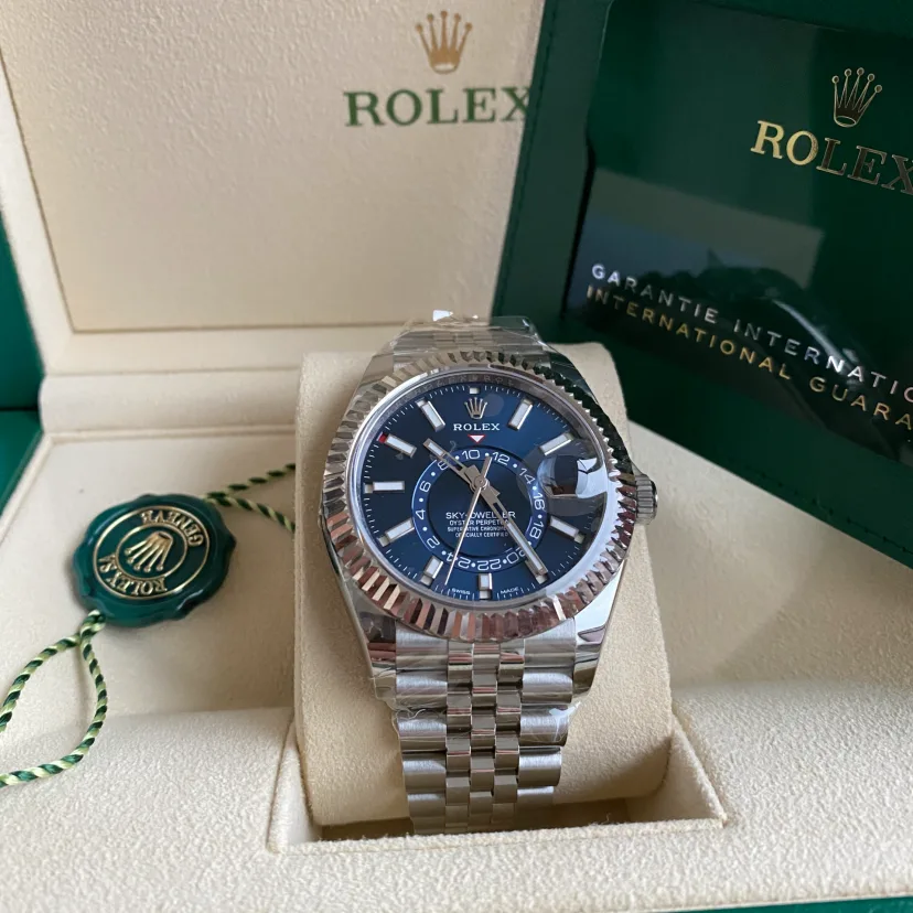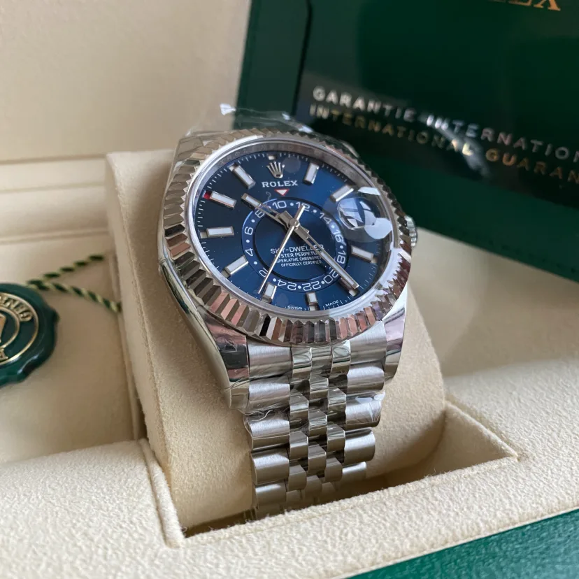 The Oyster Perpetual Sky-Dweller in Oystersteel and white gold with a bright blue dial and a Jubilee bracelet.