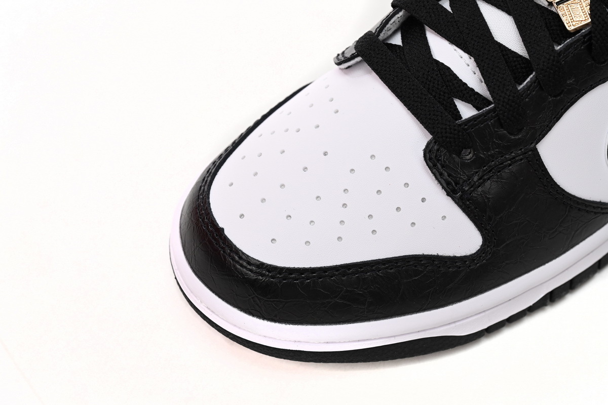 Sporting the timeless black and white finish. the low-top model boasts the pristine hue for its leather upper with contrasting black cracked leather adorning its overlays which adds a premium touch. Finally. patent leather Swooshes and heel overlays that bear gold detailing provide luxe appeal. followed by gold wrestling belt-inspired lace dubraes. a white midsole and black rubber outsole to round out the world champ nike dunk low design.