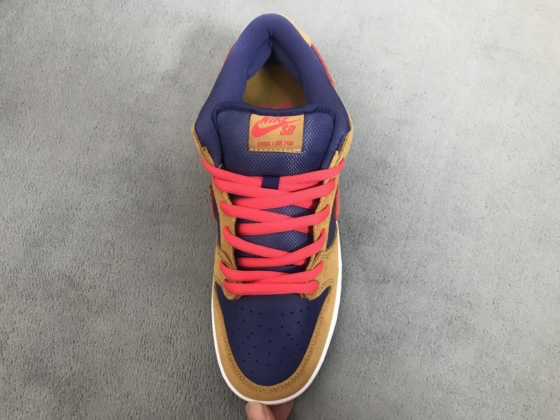 Reverse Papa Bear Dunk highlights a distinctive color combination that pairs warm earth tones with a cool purplish-blue hue. The latter is applied to the sneaker's tumbled leather upper. reinforced with suede overlays in a dark tan finish. Soft reds land on the oval laces. suede Swoosh and Nike-branded heel tab. A stuffed mesh tongue yields padded comfort. while the sockliner packs a Zoom Air unit in the heel for enhanced impact protection.