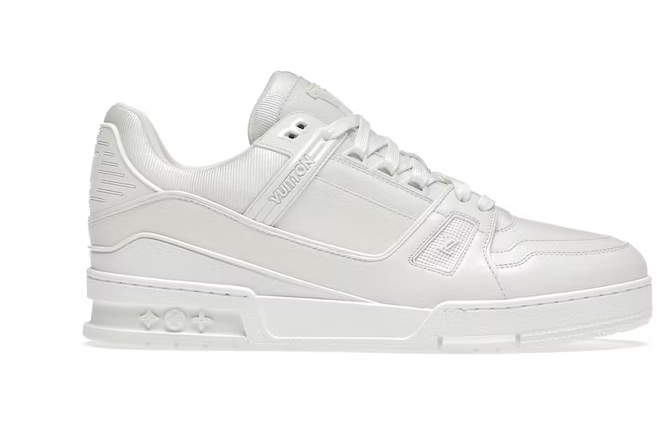 This monochrome version of the LV Trainer sneaker combines smooth and grained calf leather. Inspired by vintage basketball sneakers. this cult model was designed by Artistic Director Virgil Abloh. whose handwritten Louis Vuitton signature is embossed on the side. The #54 signature at the back refers to 1854. the year the House was founded.