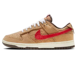 The Nike Dunk Low SP CLOT Cork celebrates the 20th anniversary of the Hong Kong streetwear brand founded by Edison Chen and Kevin Poon. The low-top features a distinctive cork upper — inspired by Chen's early days of using cork boards to gather his creative ideas — with three lace-color options and six detachable Swooshes. A woven Nike tag decorates the nylon tongue. while the CLOT logo is stamped on the medial heel. Back tabs flip up to reveal '2003' on the left shoe and '2023' on the right. with both figures expressed in Arabic numerals and Chinese characters. Underpinning the sneaker is a sturdy cupsole that pairs vintage off-white sidewalls with a dark brown rubber outsole.