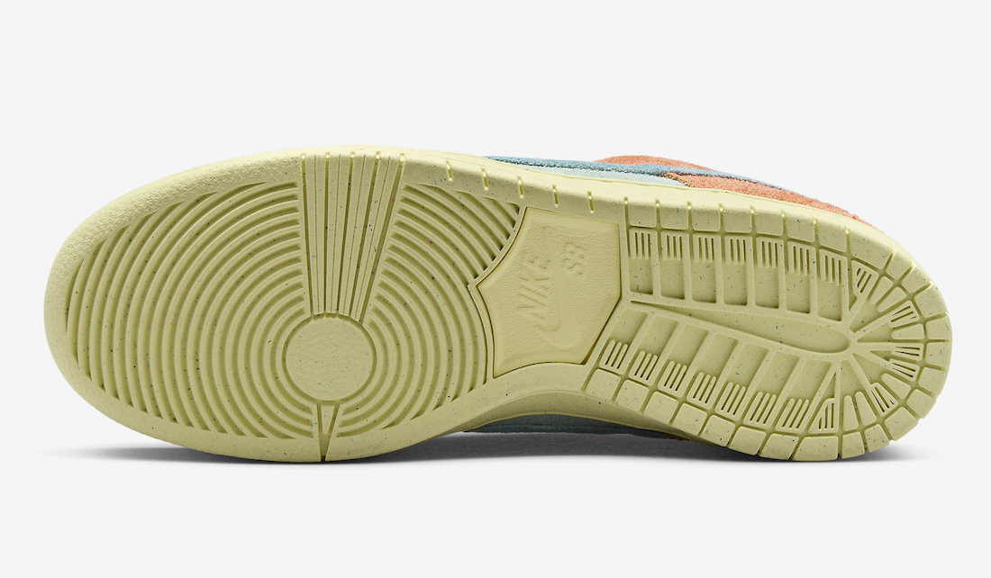 The Nike Dunk Low SB Noise Aqua showcases hairy suede on the upper. featuring a base color in Emerald Rise with contrasting orange overlays at the forefoot and heel. The signature Swoosh appears in aqua blue suede. matching the Nike logo hits that adorn the tongue tag and back tab. The insole packs a Zoom Air unit in the heel for impact protection. Underpinning the sneaker is a durable rubber cupsole in Lemon Chiffon.